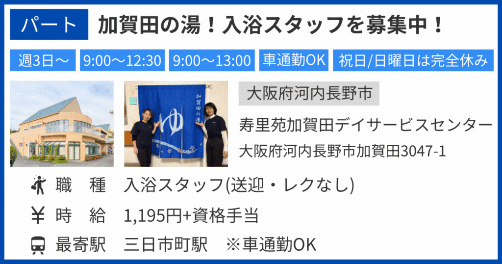 【大阪府河内長野市/介護職/パート】寿里苑加賀田デイサービスセンターの求人情報