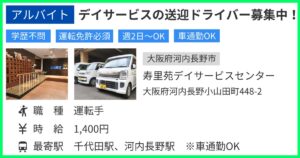 | 勤務地 | 寿里苑デイサービスセンター 大阪府河内長野市小山田町448-2 |