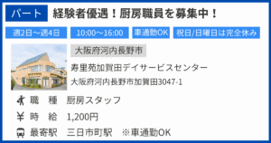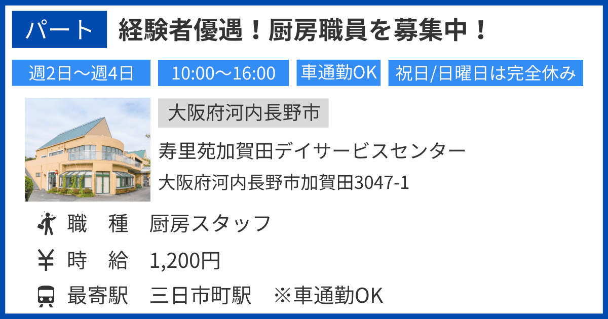 | 勤務地 | 寿里苑加賀田デイサービスセンター 大阪府河内長野市加賀田3047-1 |