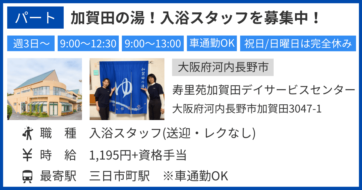 | 勤務地 | 寿里苑加賀田デイサービスセンター 大阪府河内長野市加賀田3047-1 |