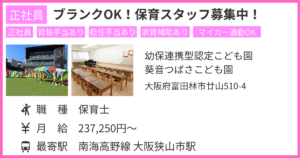 | 勤務地 | 幼保連携型認定こども園 葵音つばさこども園 大阪府富田林市廿山510-4 |