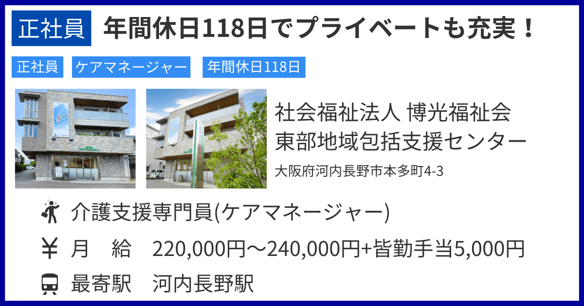| 勤務地 | 河内長野市東部地域包括支援センター 大阪府河内長野市本多町4-3 ★車通勤OK |